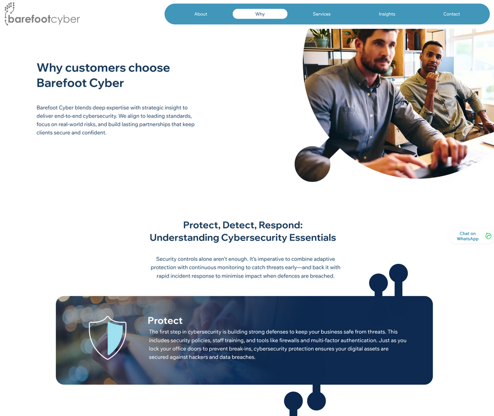 Barefoot Cyber’s site positions the firm around a holistic approach to cyber risk—Protect • Detect • Respond—pairing strong security controls with continuous testing, monitoring, and rapid incident response. A credibility-first marketing site that explains services clearly, showcases partner strength, and gives multiple low-friction ways to engage—supporting Barefoot Cyber’s teams in both the UK and South Africa.